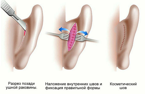 Разрез проходит по задней части уха, поэтому после заживления, рубцы становятся практически незаметны. Чтобы добиться максимальной симметричности операцию проводят сразу на двух ушных раковинах.